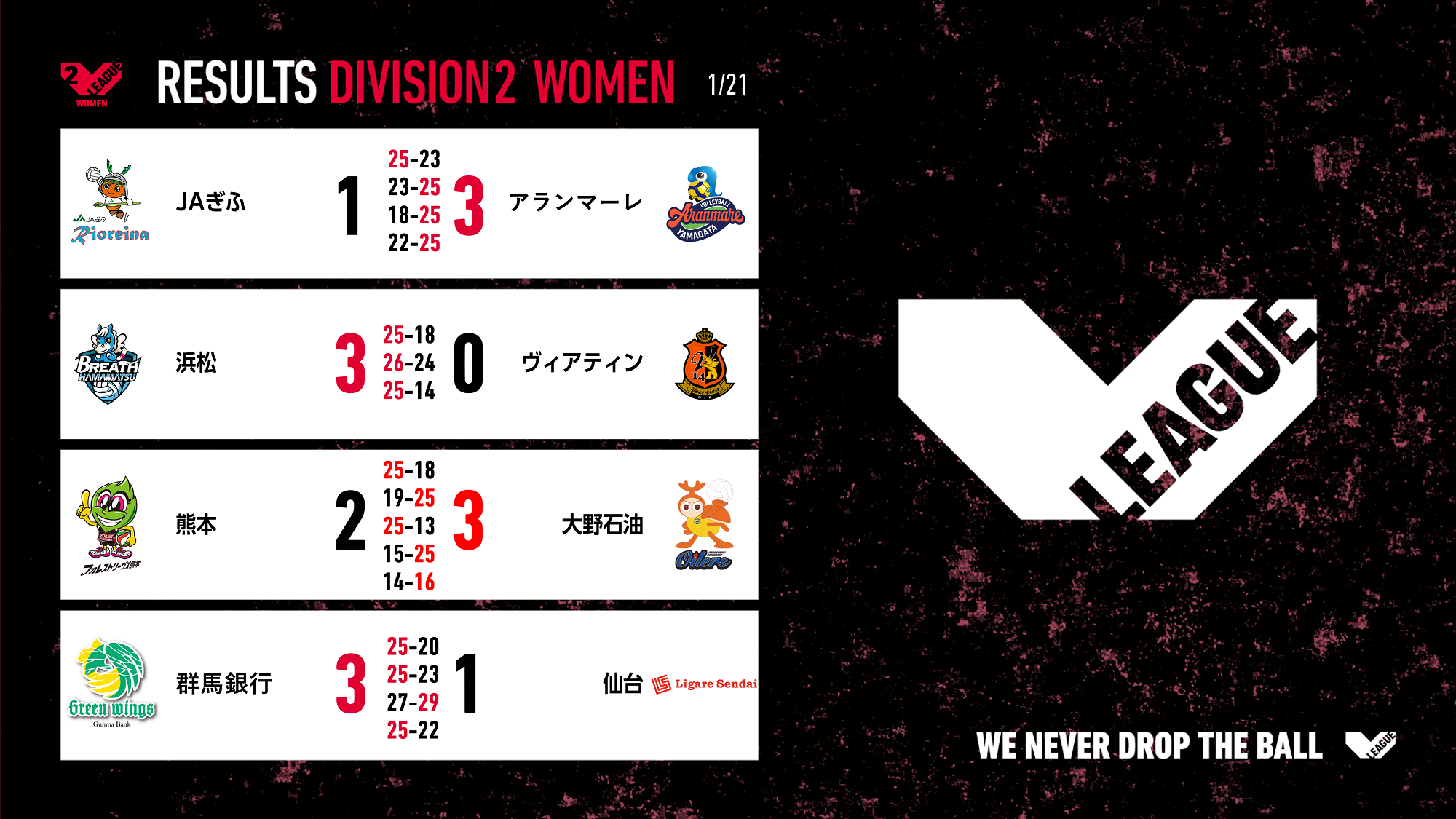 バレーボール国内最高峰リーグ V.LEAGUE【1月21日の試合結果】