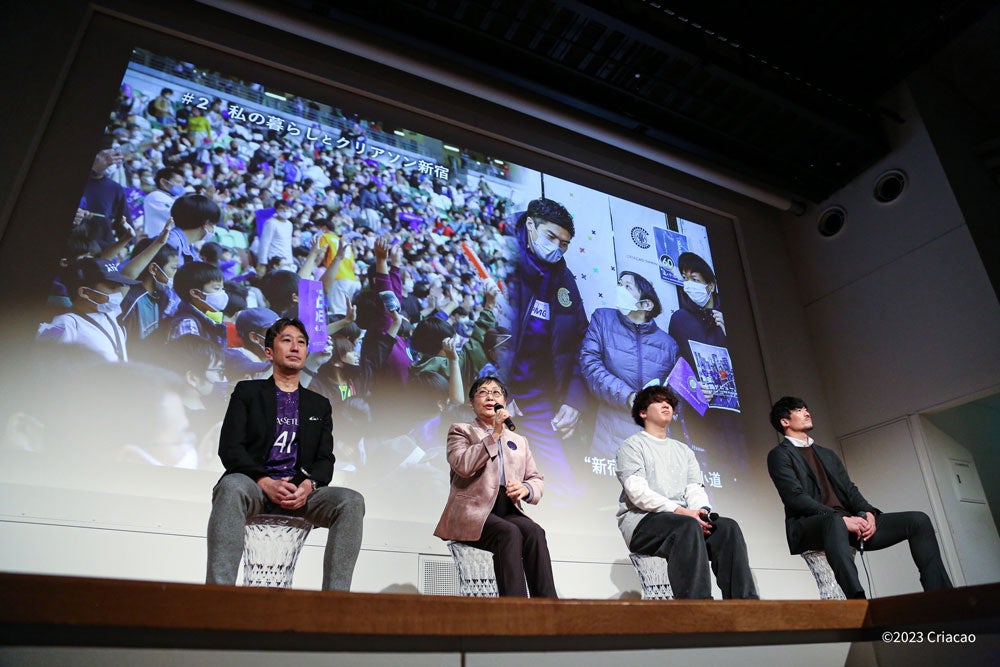 トークセッションでは「新宿のこれからとクリアソン新宿」をテーマに、新宿区 吉住健一 区長、東京商工会議所新宿支部 髙野吉太郎 会長、クリアソン新宿 キャプテン 須藤岳晟が、「私の日常とクリアソン新宿」をテーマに、新宿三丁目でBar J-club を営む川元隆史さん、新大久保商店街振興組合の伊藤節子さん、新宿区にある桜美林大学の学生、佐藤晴さん、クリアソン新宿からは岩舘直が登壇しました。