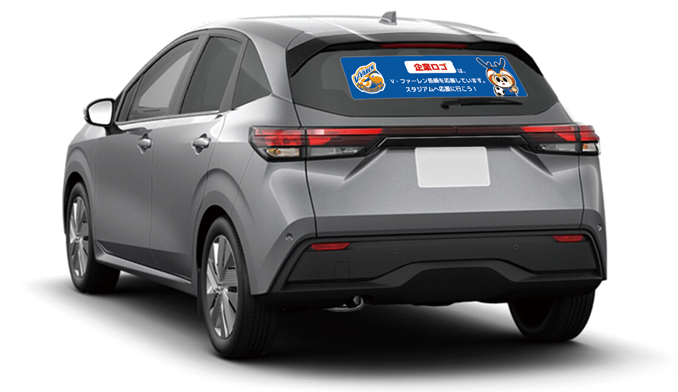 新企画では、個人向け・法人向け共に「Jリーグマスコット総選挙ヴィヴィくん応援ステッカー」と「総選挙後も引き続き貼れるV・ファーレン長崎応援ステッカー」の2種類を販売します(上図イメージ)。自家用・社用車のリアウィンドウにステッカーを貼り(右図参照)、いつものように走行して「V・ファーレン長崎」を総選挙から今シーズンにかけて応援していただきます。個人向けには、参加特典として、ヴィヴィくん考案の非売品「サイン入り実写Tシャツ」をプレゼントします。