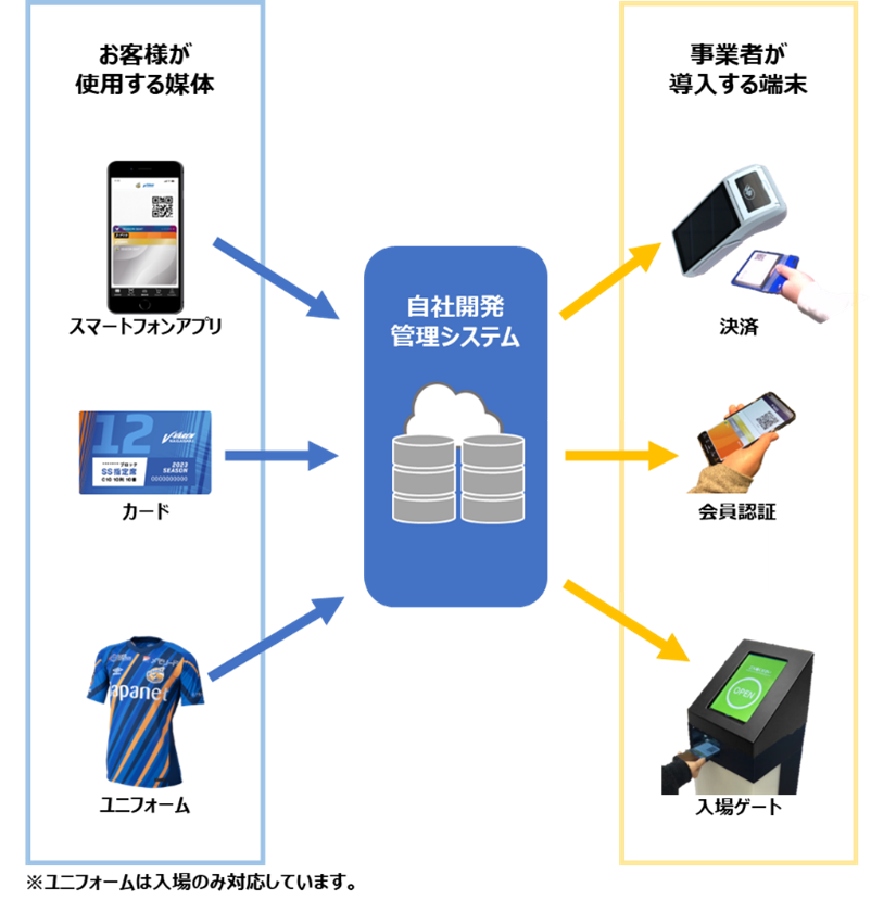 長崎スタジアムシティでのサービス提供を見据えて、試合観戦に必要なチケット管理や会員管理、スタジアムでの決済を自社のシステムで一元管理する仕組みを構築いたしました。この度、自社システムでの管理に集約させたことで、運営事業者側は、1つの端末で制御することが可能となり、お客様は入場や決済などのあらゆるシーンにおいて、お好きな方法でサービスを受けることが可能となります。まずは、今シーズンのV・ファーレン長崎ファンクラブアプリに本サービスを導入いたします。お客様はスマートフォンアプリ上に表示される専用のQRコード*¹1つで、入場チケット、ファンクラブ会員証、決済としてもご利用いただけます。また、スマートフォンをお持ちでないお客様向けに、同様の機能を搭載したカードタイプもご用意しています。お客様がより快適に、より便利にスタジアムでの時間を過ごしていただけるよう努めてまいります。