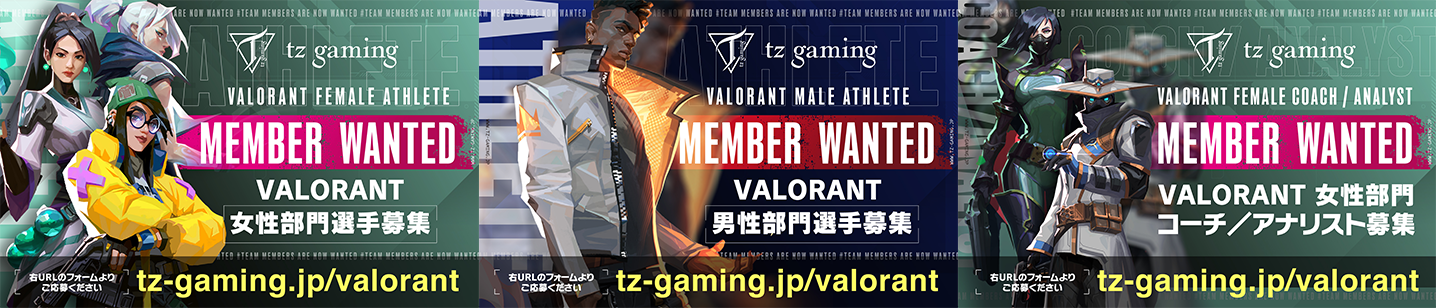 VALORANT 女性部門、男性部門、コーチ、アナリストを募集中です。募集概要や応募要項の詳細は「TZ gaming」公式HPをご確認ください。