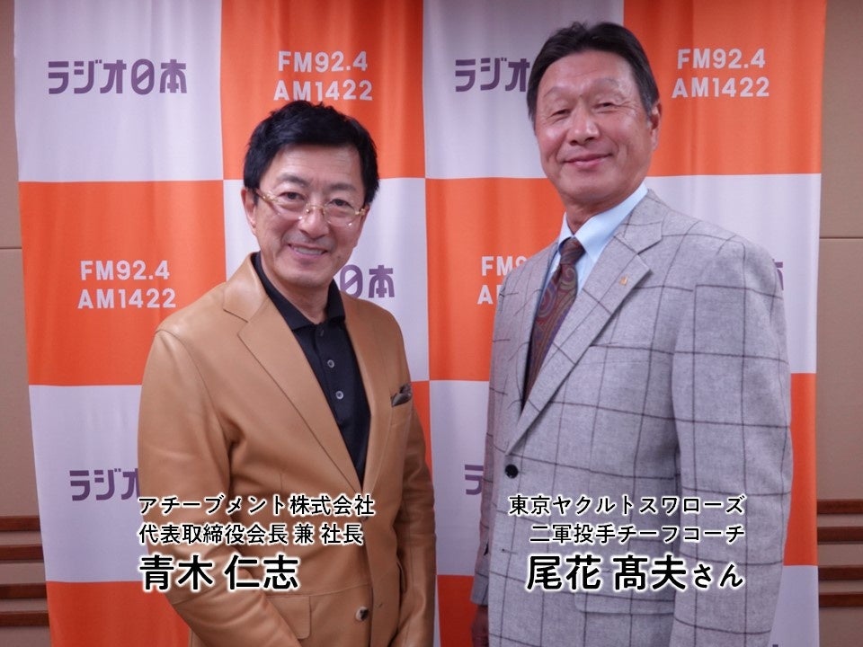 アチーブメント株式会社(所在地:東京都江東区)代表取締役会長 兼 社長の青木仁志がパーソナリティを務めるラジオ番組、青木仁志のトップリーダーと語る「成功の技術」。ラジオ日本より、毎週金曜朝の6時から始まる30分番組です。9回目・10回目の放送でゲストにお越しくださったのはヤクルト二軍投手チーフコーチの尾花高夫氏です、