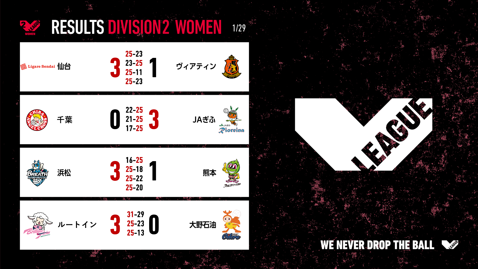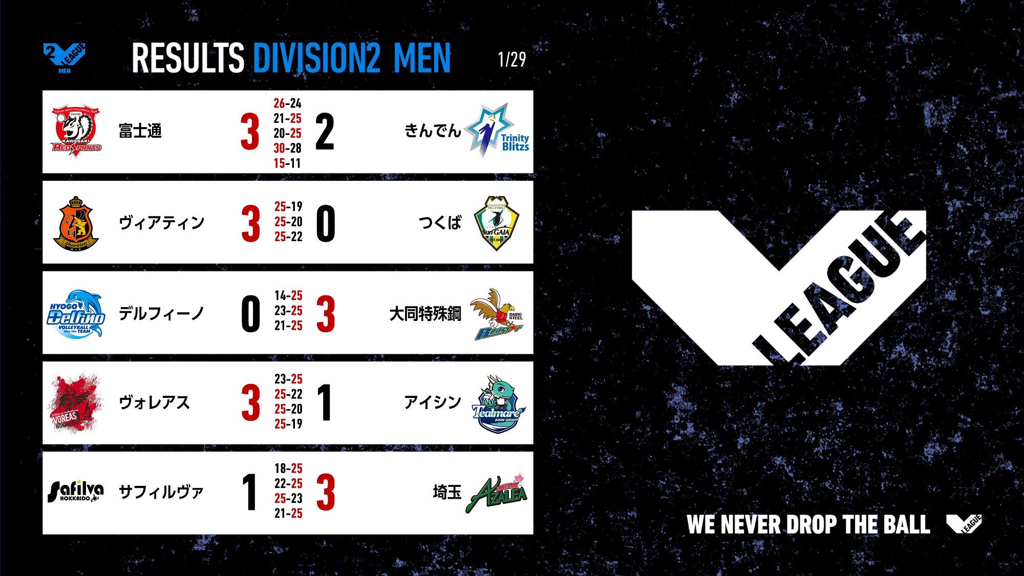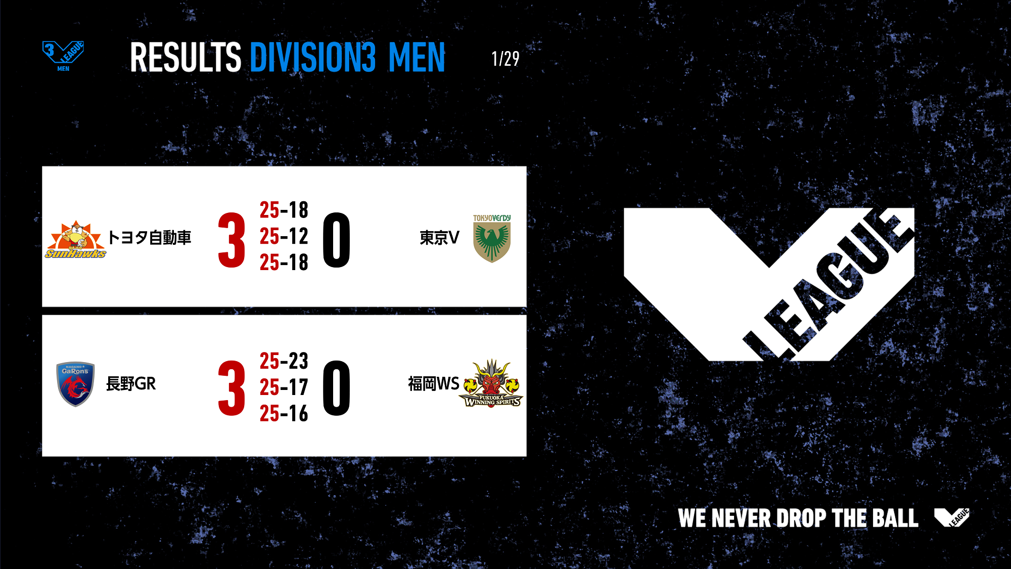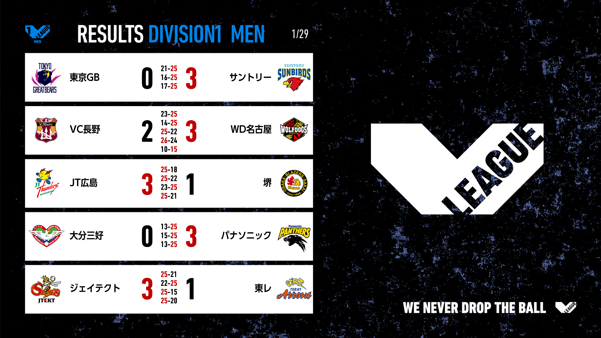 バレーボール国内最高峰リーグ V.LEAGUE【1月29日の試合結果】