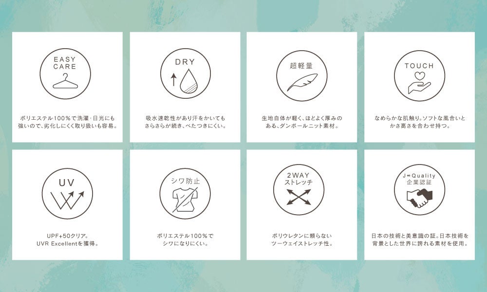 屋外でのワークアウト時に着用するウェアで気になるポイントと言えば、まずはUVケアと動きやすさ。そしてスポーツファッション性です。「YOGA by glamore」の新シリーズは、耐久性、吸水速乾性、防シワ性に優れ、軽量かつ伸縮性が高く、UVカット機能(UPF+50)も有する機能素材「NOBILUZA®」を使用、着用時だけでなく、着用後のお手入れまで快適にご使用頂けます。また、デザインにもこだわり、屋外でのワークアウトや、ヨガはもちろん、子どもとのアクティビティや、タウンユースのアイテムとしても重宝します。この新シリーズはglamore史上最高峰のJAPAN QUALITY仕立てとなっています。