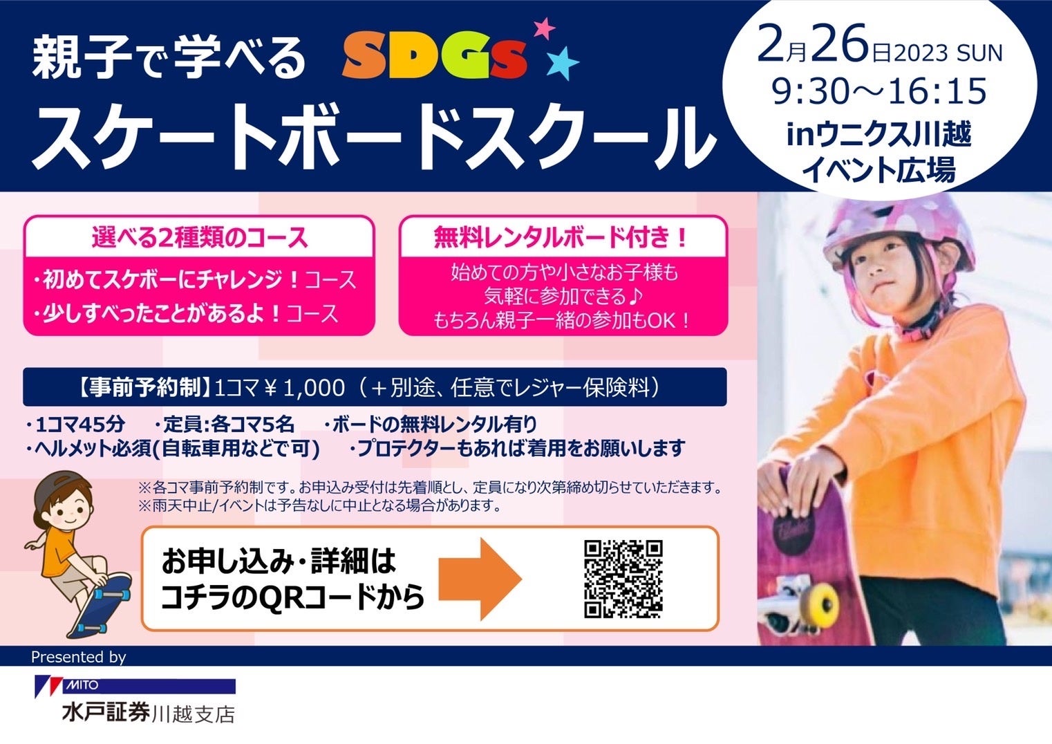 子どもたちに無料で様々な運動機会を提供するプラットフォーム「co-ed Sports(コエドスポーツ)」を運営している株式会社weclip(本社:埼玉県川越市、代表取締役:横田泰成)は、2023年2月26日(日)にウニクス川越イベント広場で開催される"「親子で学べるSDGs★ スケートボードスクール」presented by 水戸証券川越支店"に、協賛いたします。