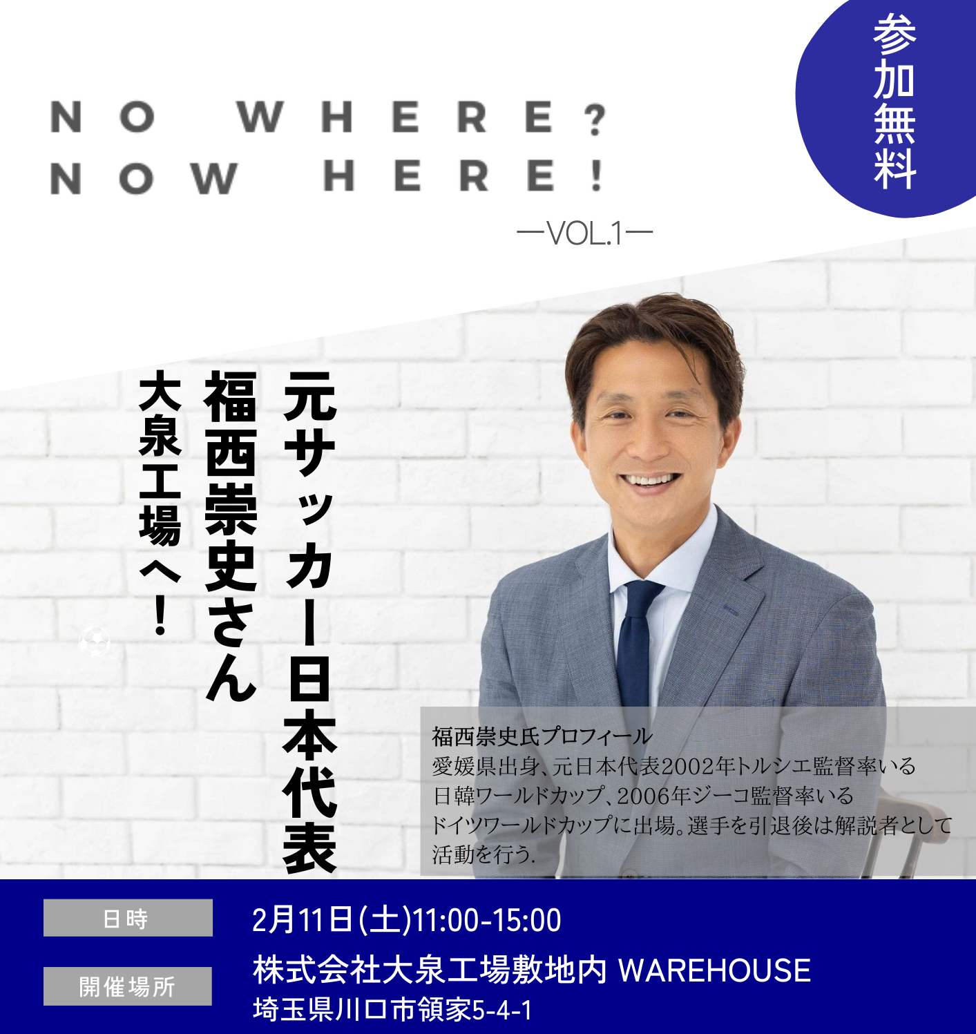 株式会社大泉工場(本社:埼玉県川口市、代表取締役社長:大泉寛太郎)は、元サッカー日本代表 福西崇史さんをお招きし、当社本社敷地である「OKS CAMPUS」https://www.oks-campus.com/ にて、トークイベント「NO WHERE? NOW HERE! vol,1」を2月11日(土)に開催します。開催当日は、地域の生産者と地元を繋ぐ川口市領家地区の活性化のマルシェ(ARTISAN)FARMERS MARKET KAWAGUCHI(アルチザン ファーマーズ マーケット カワグチ)https://oks-afmk.com/ を同時開催します。