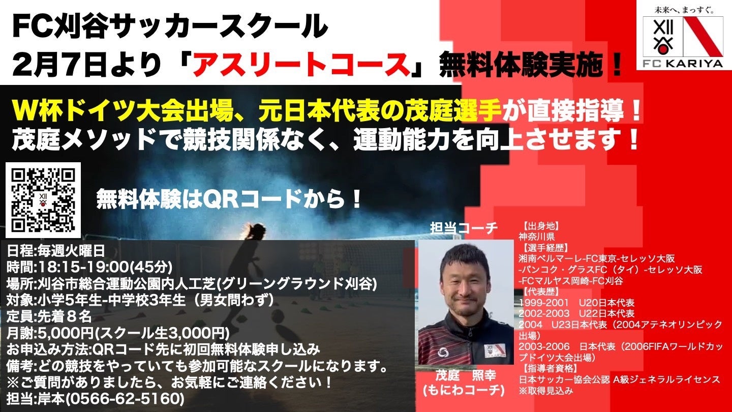 日本代表としてW杯出場経験のある茂庭照幸選手がコーチを務めるアスリートコースを開設しましたのでお知らせいたします。