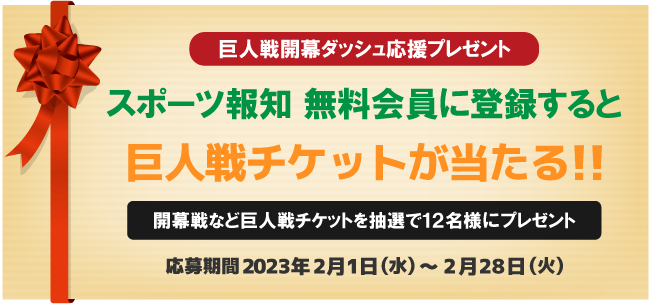スポーツ報知では3月31日、中日との開幕戦(東京ドーム)をはじめ、3、4月のジャイアンツ戦計6試合のチケットをスポーツ報知無料会員限定でプレゼントします。開幕ダッシュに挑む原巨人の熱い戦いをぜひ、球場で味わってください。応募締め切りは2月28日。当選は発送をもって代えますが、当選した方には事前にメールで連絡いたします。