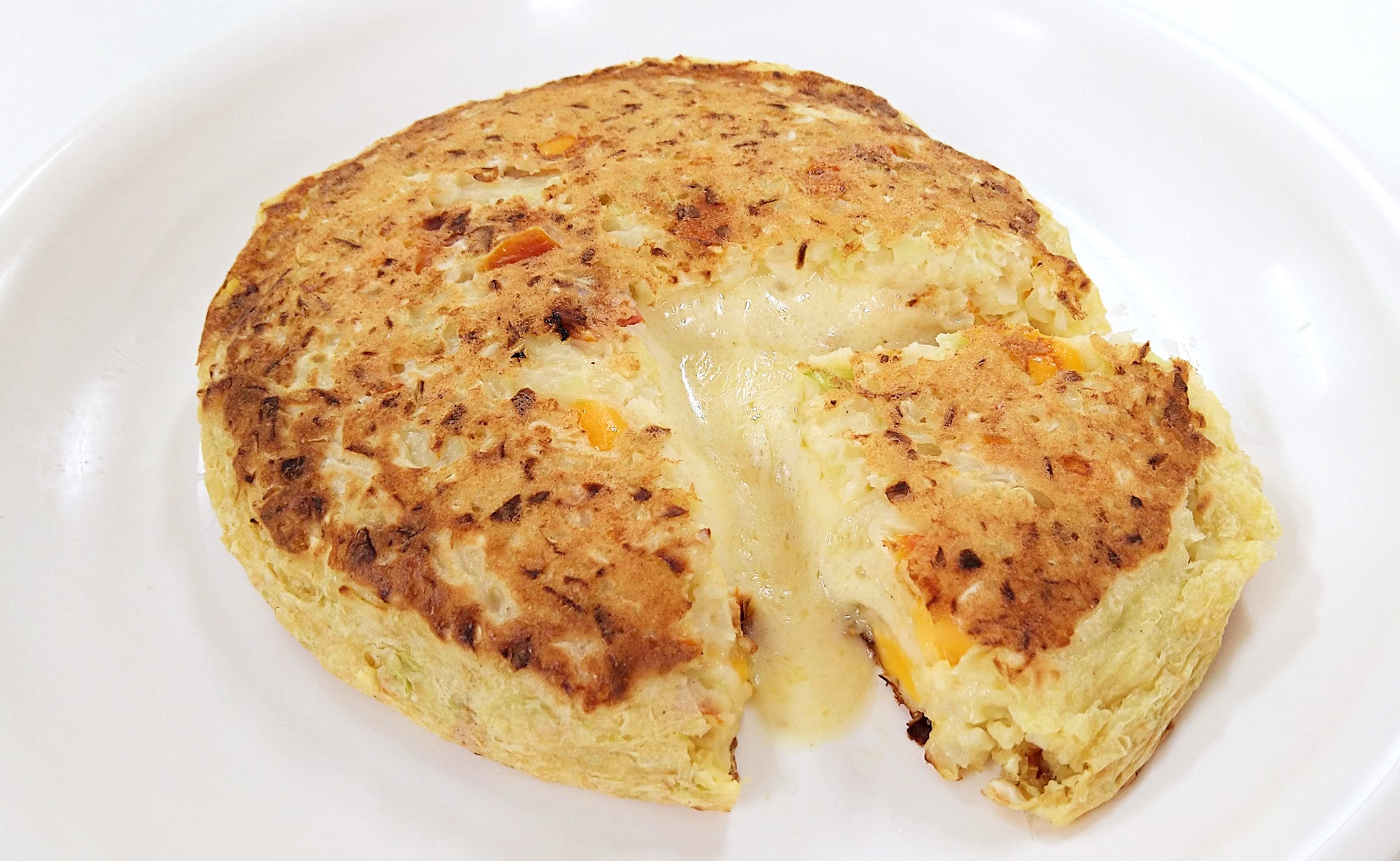 「バルミジャーノレッジャーノ」と「チェダー」を生地に入れ、「モッツァレラ」と「ゴーダ」をお好み焼きの中心に挟み込み焼き上げています。