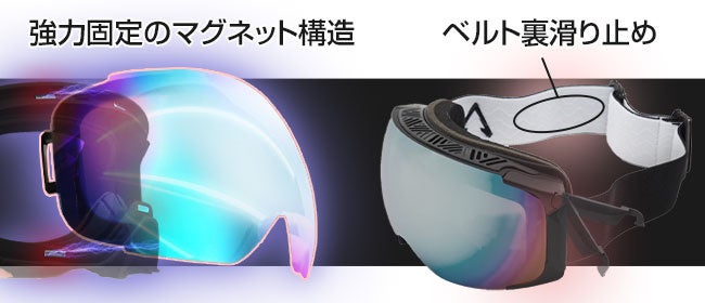 交換も簡単で、装着後はレンズのマグネットによってガタつきやズレを防止し、ベルト本体にも内側に滑り止めのシリコンが付いているので、激しい動きを伴うスキー・スノーボードの中でもストレスなくクリアな視界を提供してくれます。