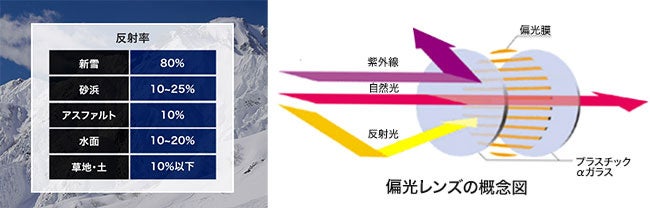 そのため偏光レンズは屋外スポーツで重宝されるレンズなのですが、特に新雪は反射光の反射率がダントツの約80%と言われており(下記表参照)、最も偏光レンズが活躍できる環境ともいえます。