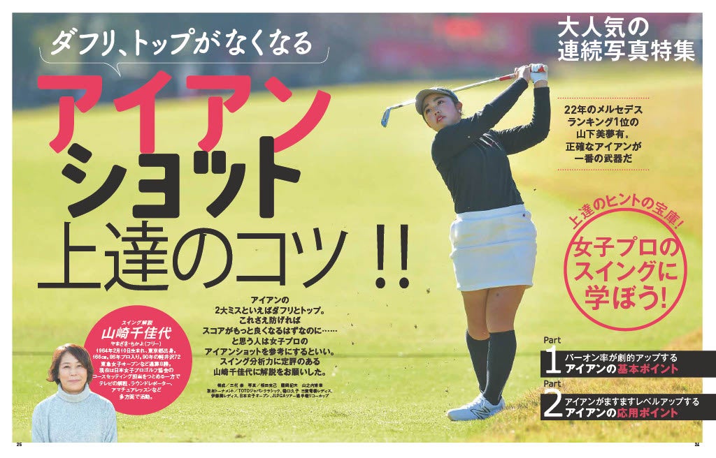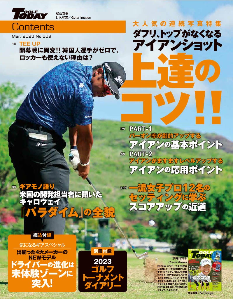 株式会社三栄(本社所在地:東京都新宿区、代表取締役社長:伊藤秀伸)は、2023年2月3日より『GOLF TODAY 2023年3月号』を発売いたします。巻頭特集は女子プロの連続写真をふんだんに使用した「アイアンショット上達のコツ」。解説は本誌初登場の山崎千佳代プロ。ツアーではトーナメントコースのセッティングやテレビでのラウンドレポーターとして知られる人気者。アイアン上手でパーオン率上位のプロをピックアップして、そのスイングの良い点などを解析して読者に伝えています。特にアイアンのミスとして取り上げられるダフリとトップのミスがなくなるポイントもピックアップして解説しています。