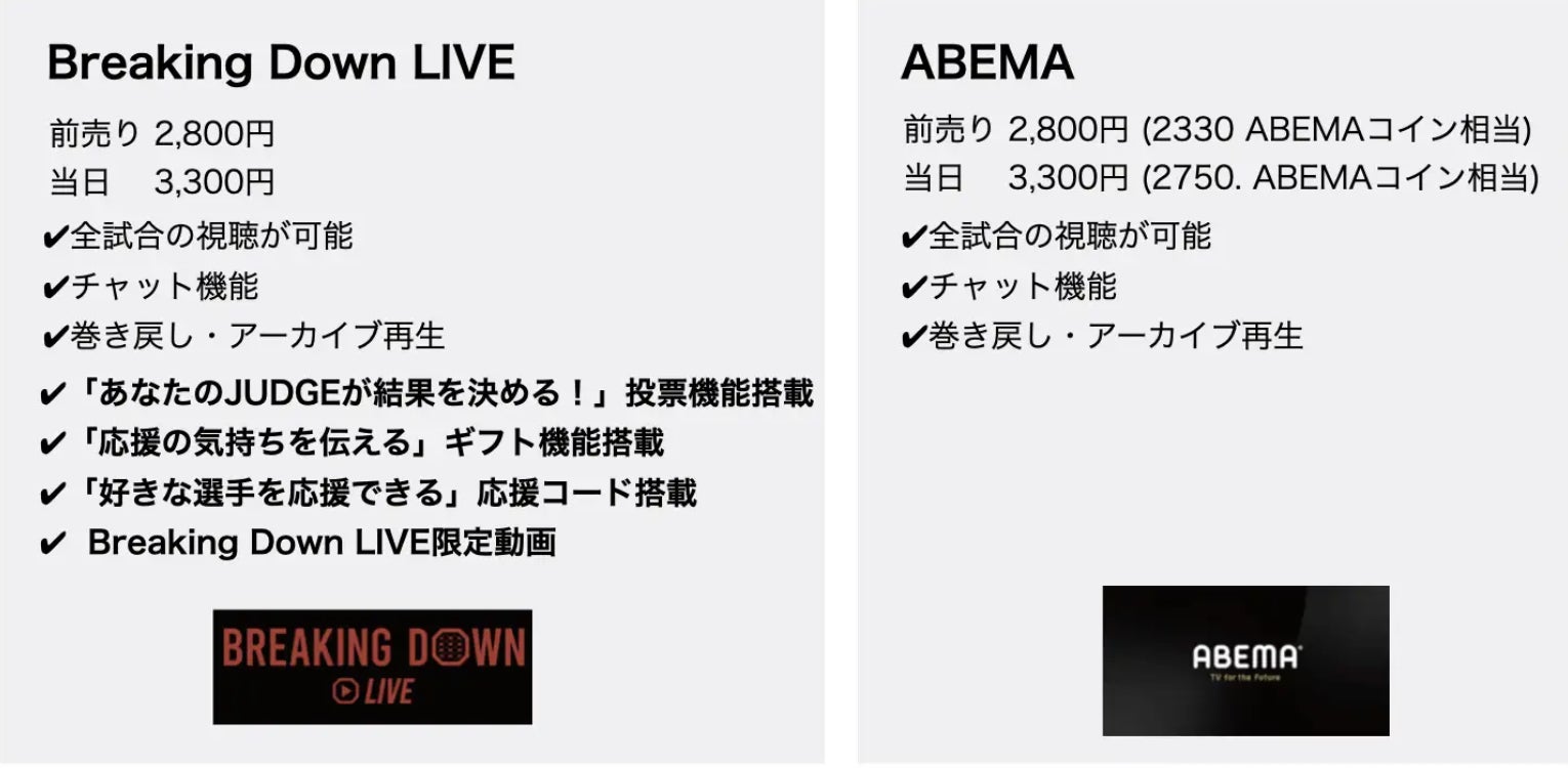 PPVチケット(オンライン視聴チケット)と会場での観戦チケット(オフラインチケット)を2月4日(日)19時より「BreakingDown LIVE」と「ABEMA PPV」で販売開始いたしますので、ぜひ、白熱の試合をリアルタイムでお楽しみください。