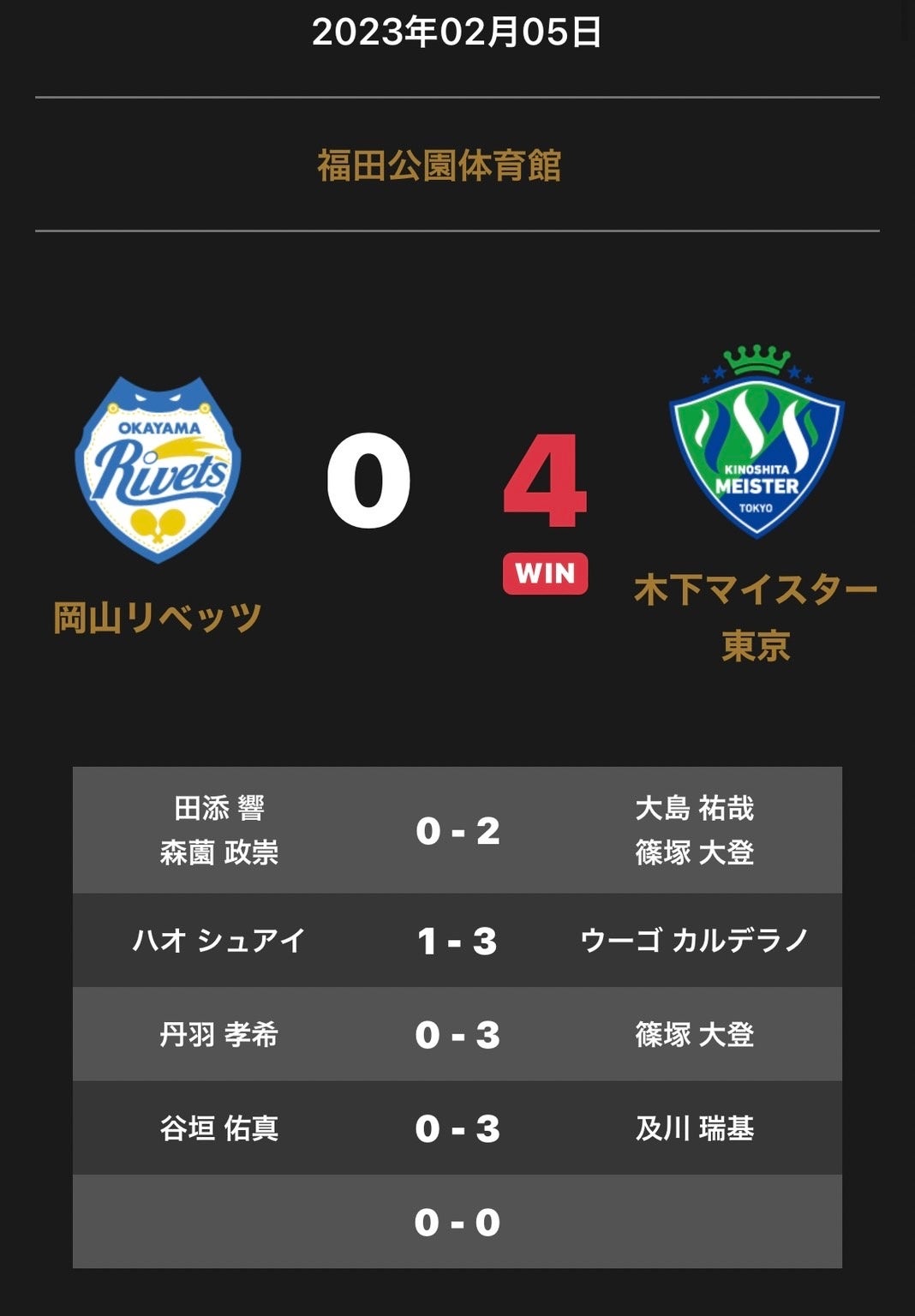 岡山リベッツと木下マイスター東京の試合は0-4で木下マイスター東京が勝利しました。