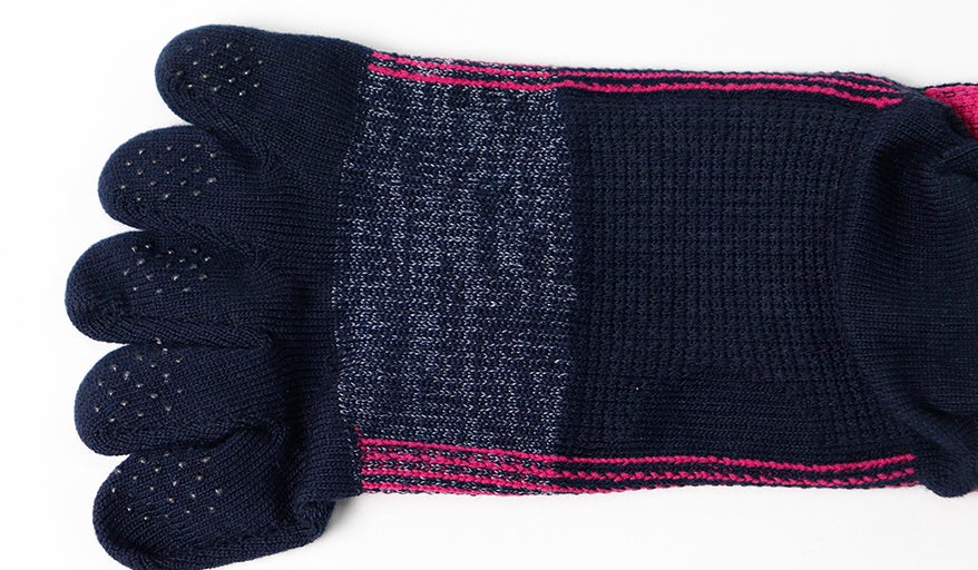 加えて本商品には、脚力を無駄なく地面に伝える滑り止め素材を編み込む「ベアグリップ」や、3D立体編みによって指間の摩擦を軽減し痛みの発生などを抑える5本指仕様、吸水速乾性と抗菌防臭性に優れたアクリル綿混糸の「β・ビーン」繊維を使用しています。