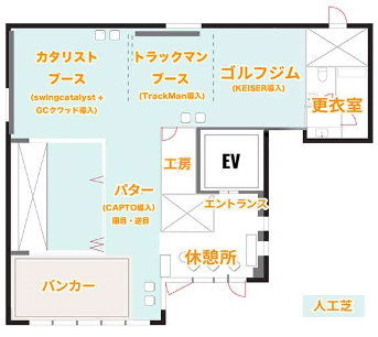 パタースペースにはバッティング解析センサー「キャプト」を導入。また、徹底的アプローチのトレーニングために順目・逆目の人工芝を配置しています。