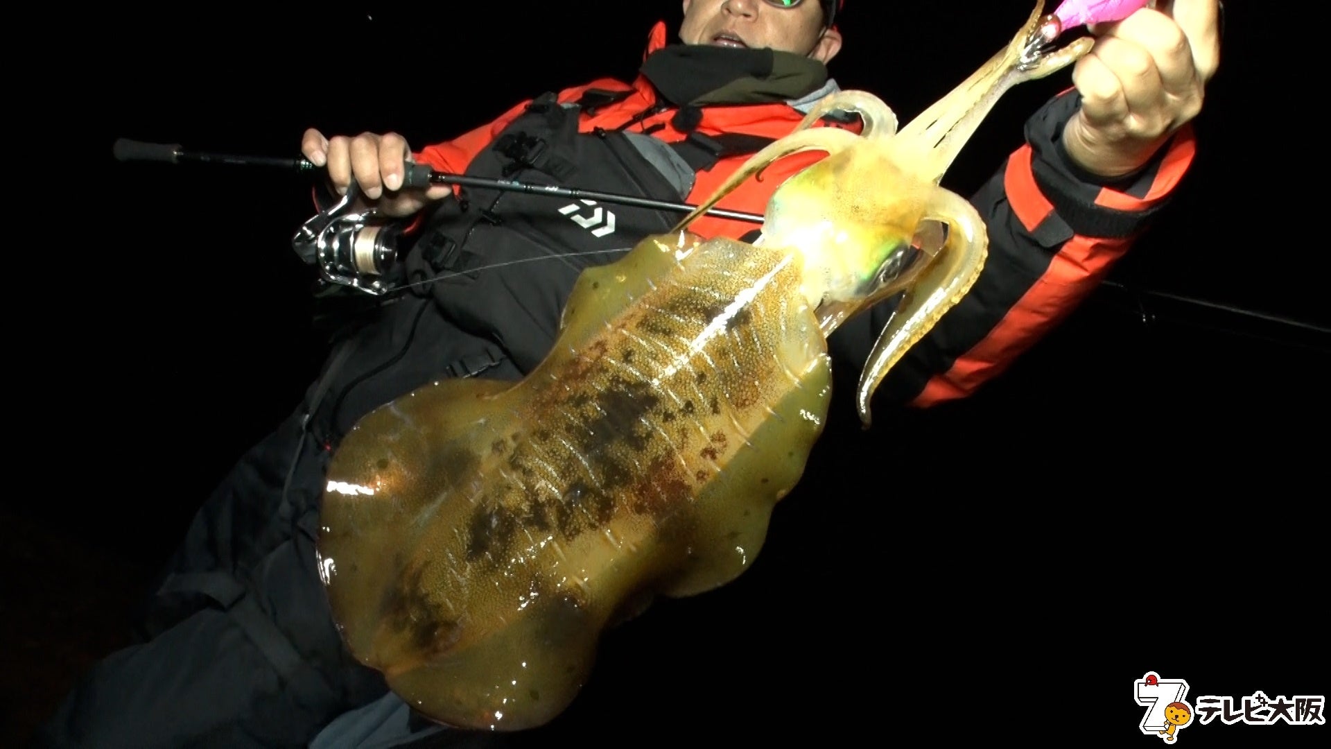 さすがのカリスマも大ピンチかと思ったが、そんな状況の中でも、山田は着実に釣果を上げる。長年の経験で磨き抜かれた鋭い観察眼と、状況に合ったタックルとルアーセレクト。ゆっくり沈む“スローシンキング”タイプのエギや、繊細なアタリも感知できるメタルトップのロッドなど、タックルの特性を活かして、型のいいアオリイカをキャッチ。そして、ロケ終了間際にかけたのは…!?
