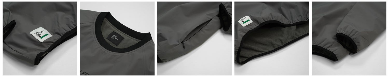 ストレッチ性のあるポリエステル素材リップストップ生地を採用したプルオーバー。撥水加工を施した生地は高耐水圧・透湿性を併せ持つため、雨などの水滴の浸透を防ぎ汗などの蒸気を逃がします。また裏地には冬用アウトドアウェアにも使用される厚みのフリース生地(180g/㎡)を重ね、風も防ぐ暖かい仕様に。