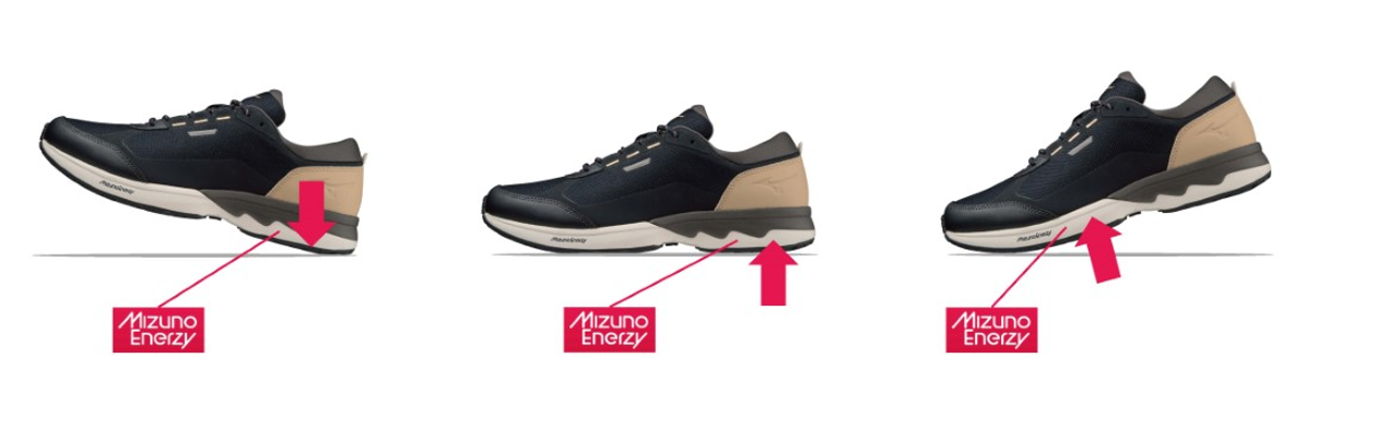 これにより接地時のクッション性と安定性の向上を追求しています。さらにミッドソールには、やわらかく反発性の高い素材『MIZUNO ENERZY FOAM』を採用しました。これらを組み合わせることにより、後足部では接地時の衝撃を緩和し、接地から蹴りだしに向けてスムーズな体重移動を実現します。また、前足部にも『MIZUNO ENERZY FOAM』を搭載することで、より力強い蹴りだしが可能になり、接地から蹴りだしまでのスムーズな歩き心地を追求しています。