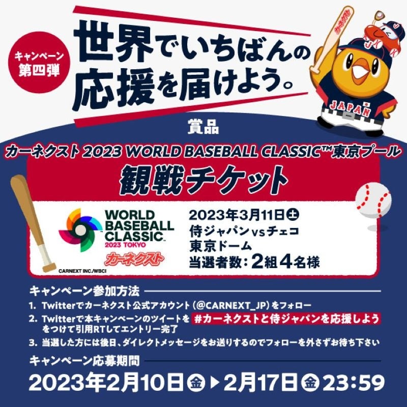 カーネクスト公式Twitterアカウントをフォローし、対象投稿に「#カーネクストと侍ジャパンを応援しよう」をつけて引用リツイートして頂くと、抽選で2組4名様に、2023年3月11日(土)に東京ドームにて開催される『カーネクスト2023 WORLD BASEBALL CLASSIC™ 1次ラウンド 東京プール』侍ジャパンVSチェコ代表 の観戦チケットをプレゼントいたします。