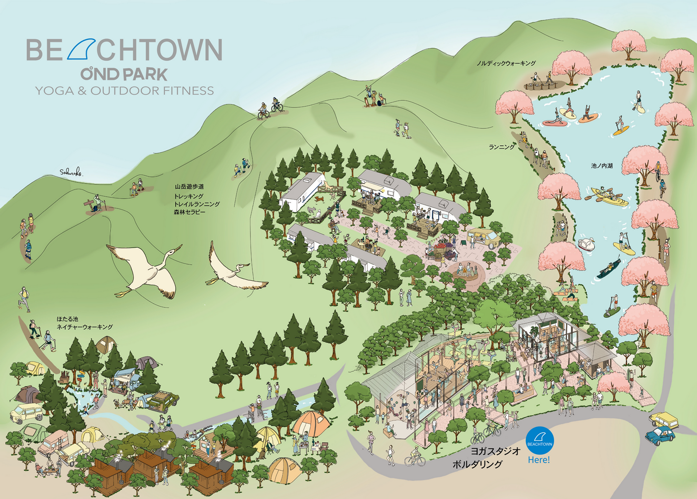 「BEACHTOWN OND PARK(ビーチタウンオンドパーク)」は、佐賀県武雄市の貴重な生態系が息づく約100ヘクタールの広大な武雄温泉保養村に誕生する「OND PARK」内にオープンします。森に囲まれたヨガスタジオ&ボルダリングジム・大自然の中で行うアウトドアフィットネスなど健康的なサービスを展開します。癒しを通じて「心と身体」を、 交流を通じて「人との関係」を、 運動を通じて「地域のあり方」を整えます。