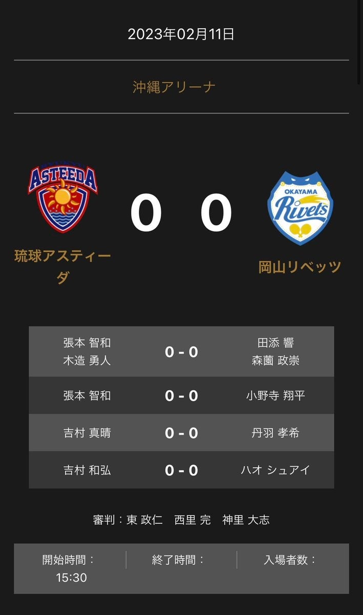 ホームプレスリリース ノジマTリーグ 2022-2023シーズン 公式戦 2月11日(土) 15:30 試合開始 琉球アスティーダ vs 岡山リベッツ 対戦オーダー発表 2023年02月11日 15時06分 公開|スポーツマニア編集部プレスリリース 一般社団法人Tリーグのプレスリリース ノジマTリーグ2022-2023シーズン 公式戦 2月11日(土) 15:30試合開始 試合会場 沖縄アリーナ 琉球アスティーダ vs 岡山リベッツ 対戦オーダーが発表されました。