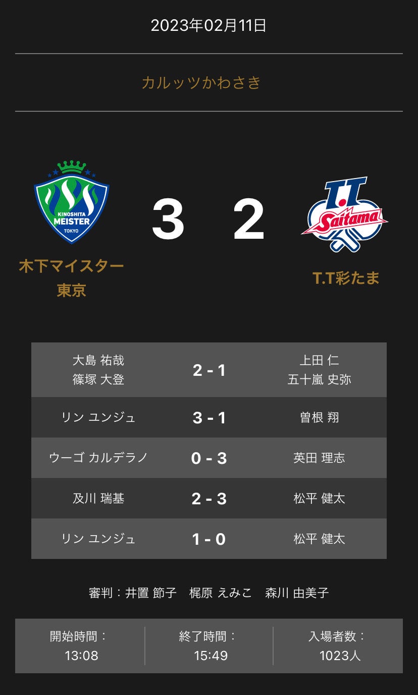ホームプレスリリース ノジマTリーグ 2022-2023シーズン 公式戦 2月11日開催 木下マイスター東京 vs T.T彩たま 試合結果 2023年02月11日 17時06分 公開|スポーツマニア編集部プレスリリース 一般社団法人Tリーグのプレスリリース ノジマTリーグ 2022-2023シーズン 公式戦 2月11日にカルッツかわさき(神奈川県)にて開催された 木下マイスター東京とT.T彩たまの試合は、3-2で木下マイスター東京が勝利しました。