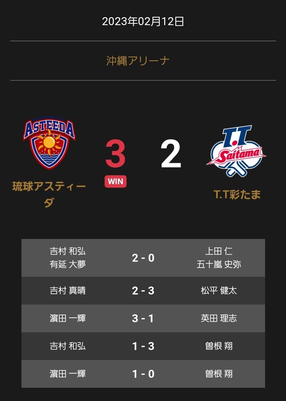 ホームプレスリリース ノジマTリーグ 2022-2023シーズン 公式戦 2月12日開催 琉球アスティーダvsT.T彩たま 試合結果 2023年02月12日 17時06分 公開|スポーツマニア編集部プレスリリース 一般社団法人Tリーグのプレスリリース 2月12日(日)13:00 試合開始 琉球アスティーダvsT.T彩たま 会場:沖縄アリーナ(沖縄県) 琉球アスティーダとT.T彩たまの試合は3-2で琉球アスティーダ が勝利しました。