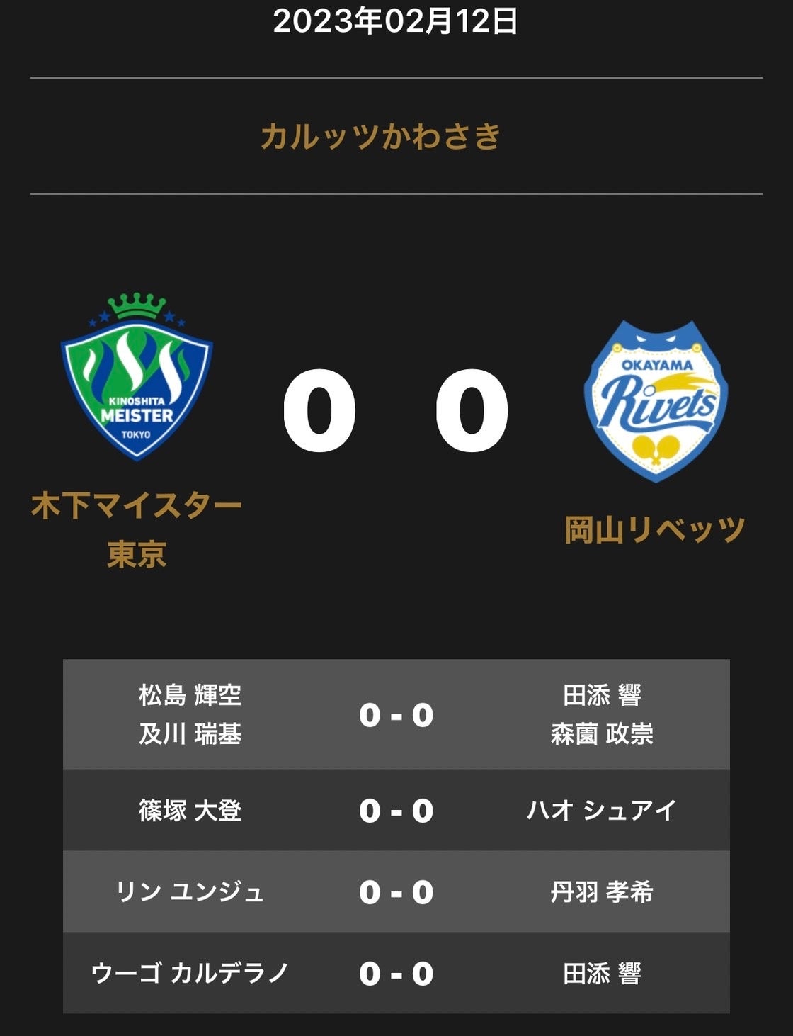 ホームプレスリリース ノジマTリーグ 2022-2023シーズン 公式戦 2月12日開催 木下マイスター東京 vs 岡山リベッツ オーダー発表 2023年02月12日 17時07分 公開|スポーツマニア編集部プレスリリース 一般社団法人Tリーグのプレスリリース 2月12日(日)16:30試合開始 木下マイスター東京 vs 岡山リベッツ 会場:カルッツかわさき(神奈川県) 対戦オーダーが発表されました。