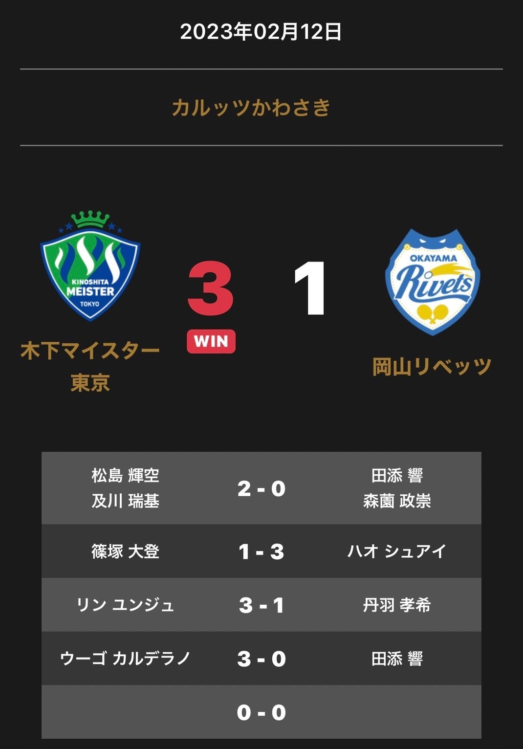 ホームプレスリリース ノジマTリーグ 2022-2023シーズン 公式戦 2月12日開催 木下マイスター東京 vs 岡山リベッツ 試合結果 2023年02月12日 21時07分 公開|スポーツマニア編集部プレスリリース 一般社団法人Tリーグのプレスリリース 2月12日(日)16:30 試合開始 木下マイスター東京vs岡山リベッツ 会場:カルッツかわさき(神奈川県) 木下マイスター東京と岡山リベッツの試合は3-1で木下マイスター東京が勝利しました。