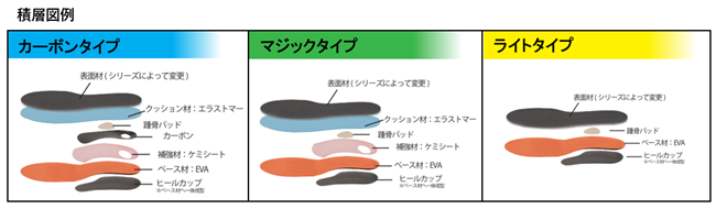 BMZ最高峰のカーボンタイプや、どのような靴にも入れやすい薄さのライトタイプなど、ご使用状況やインソールの厚み等によって選択することができます。