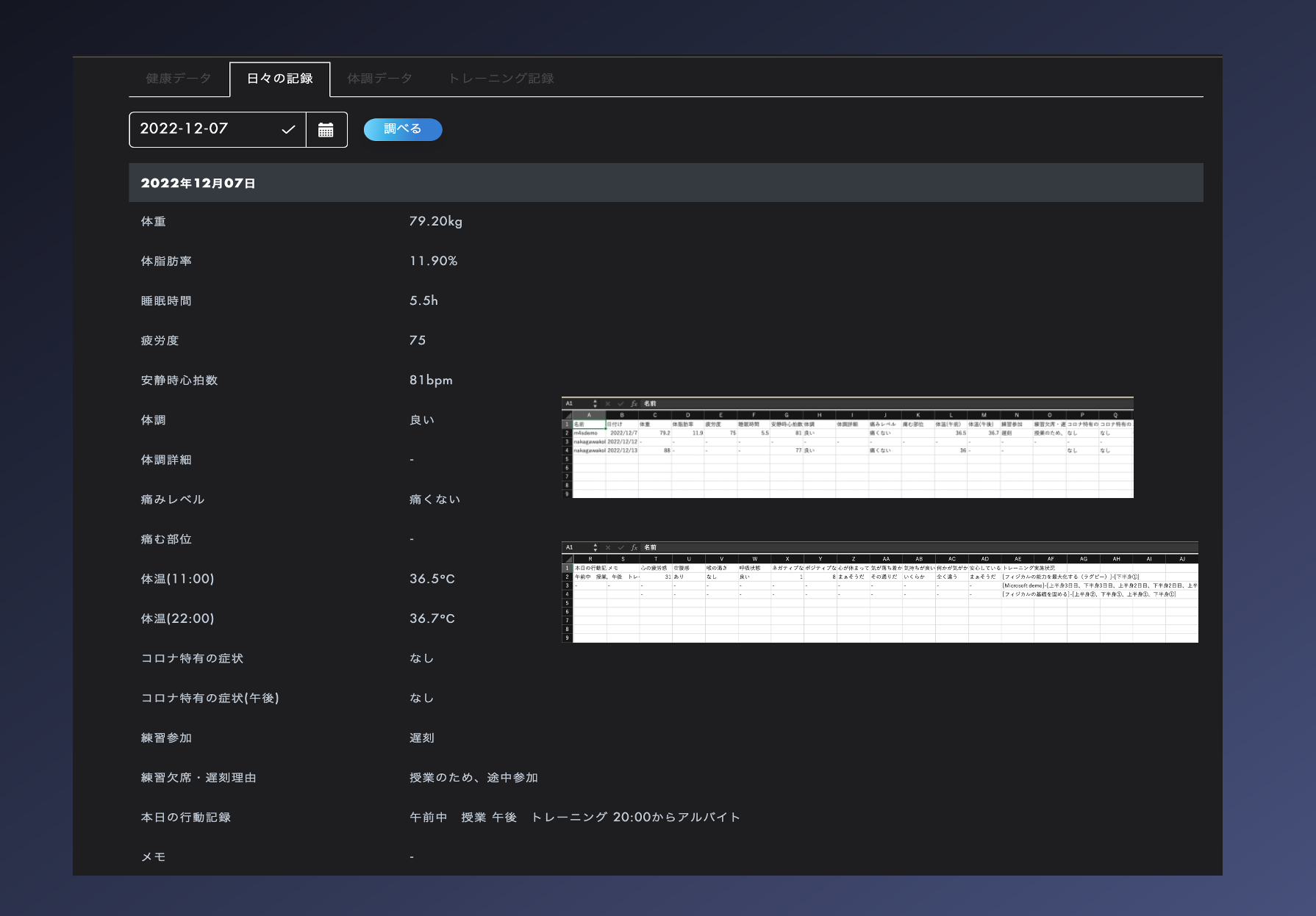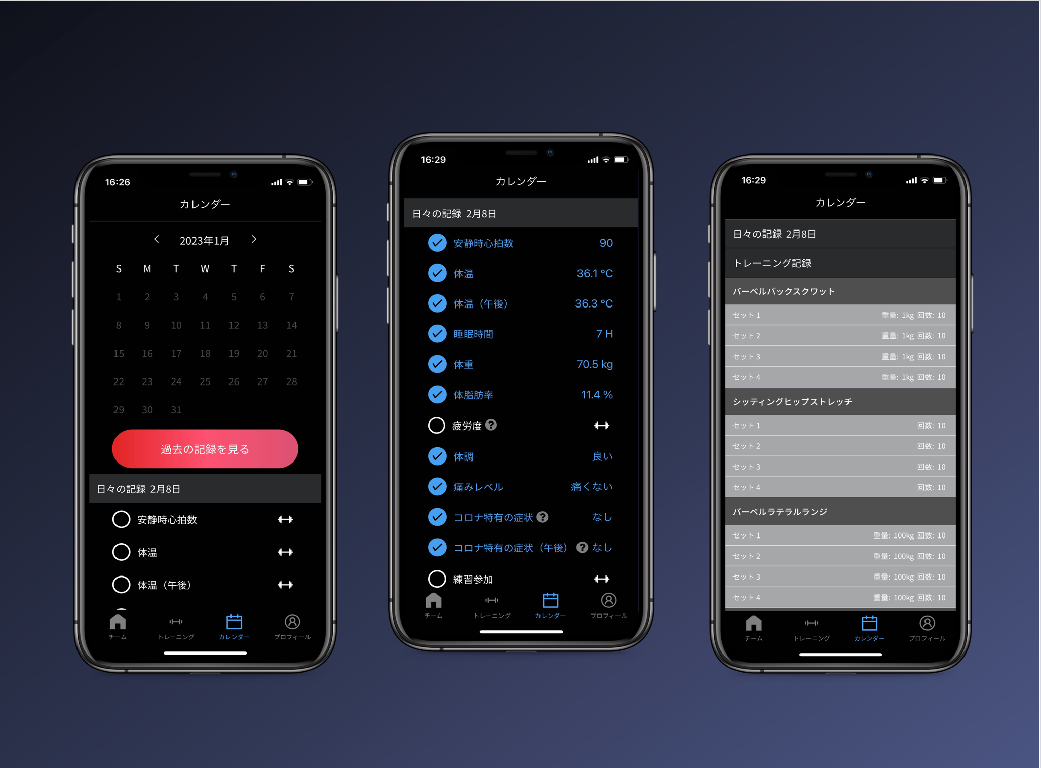 プロトレーナー監修の300を超えるトレーニング動画とそれらを組み合わせて作成されるトレーニングプラン・選手個々人の体調管理機能が備わっており、選手がアプリで入力した内容は全てデータ化され、トレーナー・コーチの管理画面にて確認・出力することが可能です。