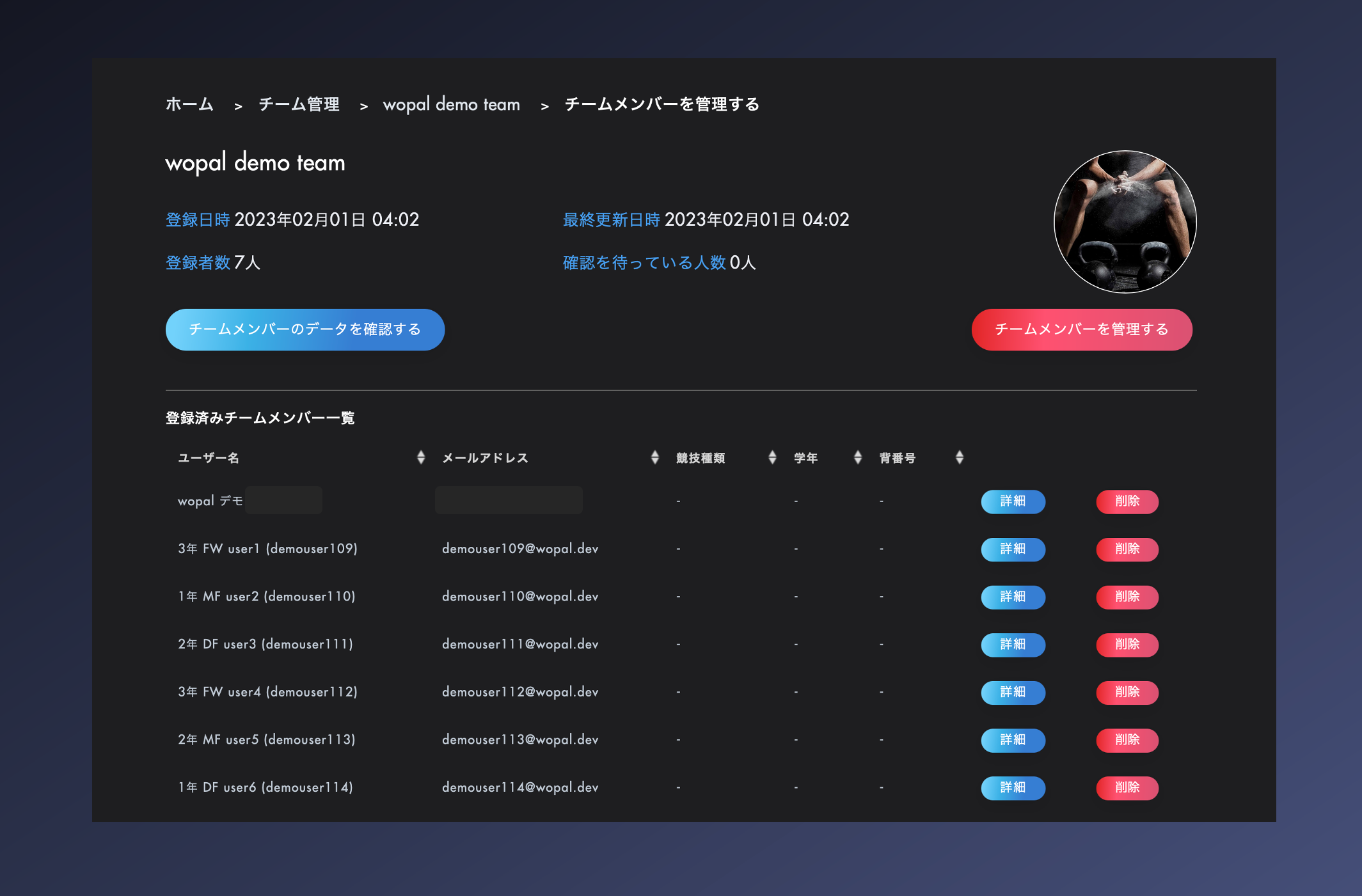 今回のデモチーム実装では実際にwopalを使用してもらい、デモ登録していただいたチームの方がいかにチームのフィジカル能力の向上に生かすかをイメージしてもらえるように基本的な機能を全て使えるようにしています。またフィジカル能力の向上には継続した日々のデータを分析する必要があることを考慮し、6名分の選手データを過去2ヶ月にわたって入力した状態で組み込んでいます。