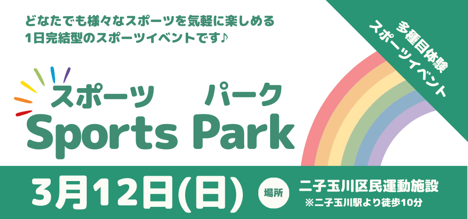 3月12日(日)に二子玉川区民運動施設にて様々なスポーツを気軽に楽しめる1日完結型のスポーツイベントを開催いたします。様々なスポーツのプログラムにどなたでもご参加できますので、ご家族やご友人と一緒にご参加ください。皆様のご参加をお待ちしております。