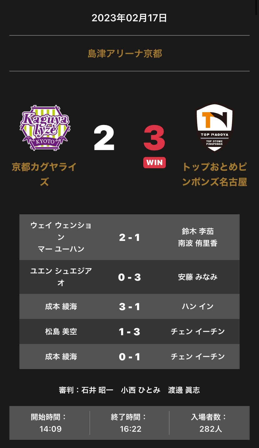 試合結果は2-3でトップおとめピンポンズ名古屋が勝利しました。