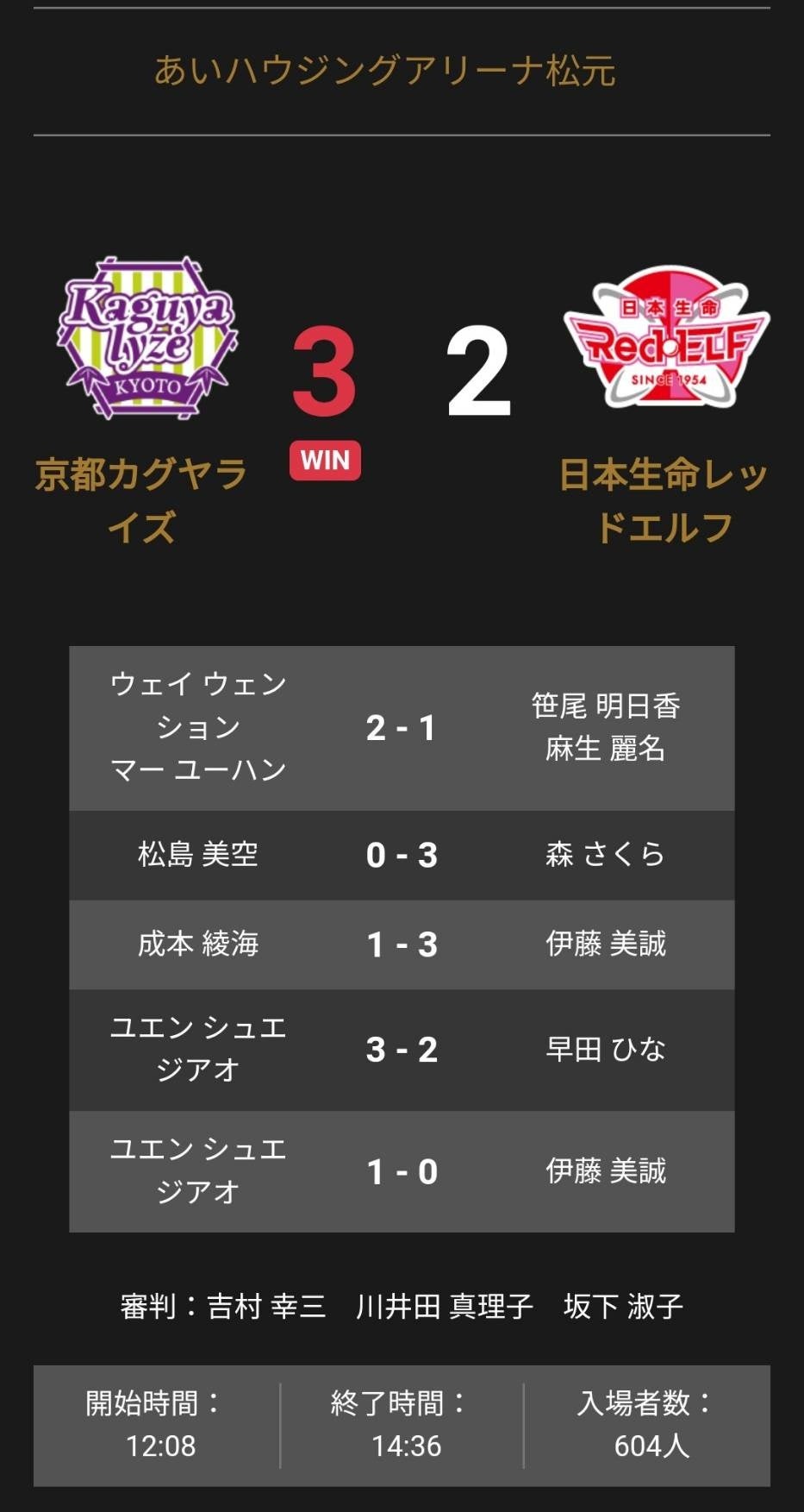 京都カグヤライズと日本生命レッドエルフの試合は3-2で京都カグヤライズが勝利しました。