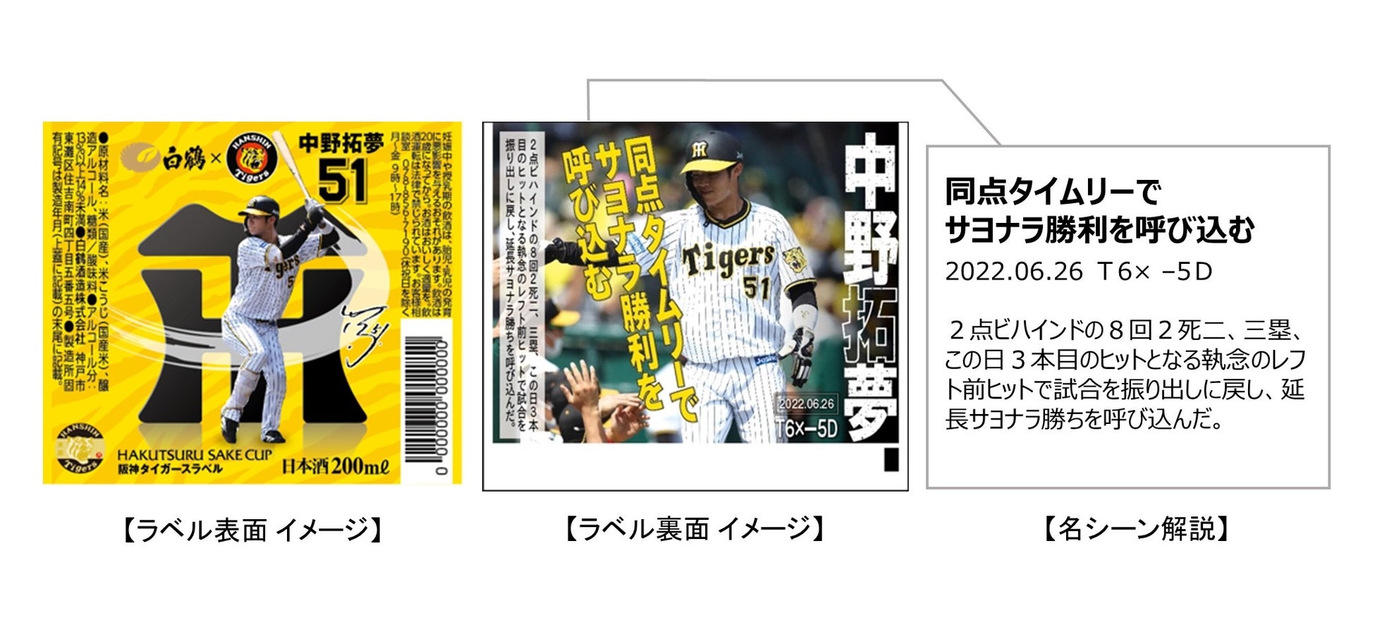 すっきりとした後口とバランスのいい味わいのサケカップに、ラベル表面には特に人気の6選手(※)の2022年の躍動感あるフォームと背番号、選手のサインをあしらい、ラベル裏面では名シーンを新聞記事風に解説しています。