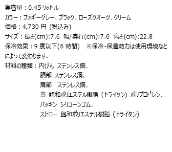 絶妙なサイズ感が特徴のH2.0真空スリムクエンチャー0.6Lの他にもう一回り小さい414mlもラインナップ。