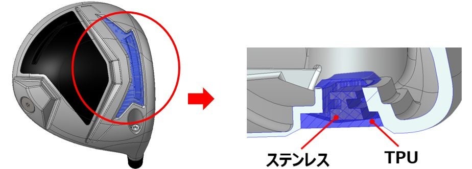 ソール部には、TPUとステンレスを一体成型した新機能『CORTECH CHAMBER』を採用しています。TPUと一体成型された鉄芯のステンレスには、飛び出し方向に進もうとする慣性の力が働きます。打球時にヘッドがボールを押し返す反力にこの慣性の力が加わることで、ボールスピードを増加させます。