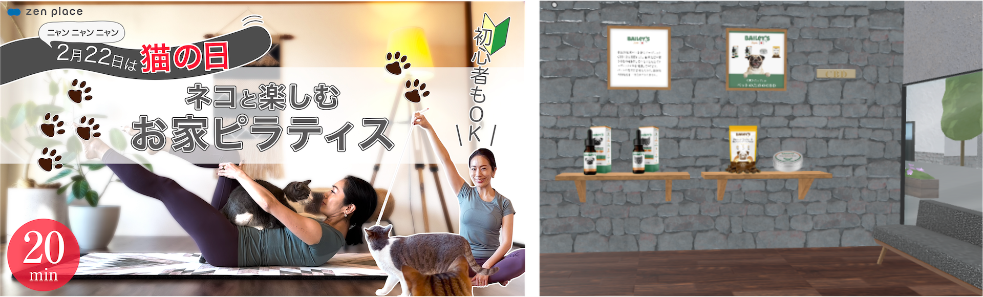 先端研究結果・科学をもとに、グローバルな環境で最新技術とDXで挑戦を重ね、サービス業界にイノベーションを起こしている最先端のWeb3.0 DX企業であり、ウェルビーイング創造のリーディングカンパニーである株式会社ZEN PLACE(本社:東京都渋谷区 代表取締役:尾崎成彦)は、2月22日の「猫の日」にあわせて、2023年2月22日(水)9:00にメタバース空間「zen place meets metaverse」にてエクササイズ動画「ネコと楽しむお家ピラティス」を特別公開、さらに近未来的なPop-upストアにてネコ用CBD商品を販売開始します。バーチャルとリアルを融合したコミュニケーションはもちろん、ご自身と大切なネコのさらなるウェルビーイングをメタバースで追求・促進します。