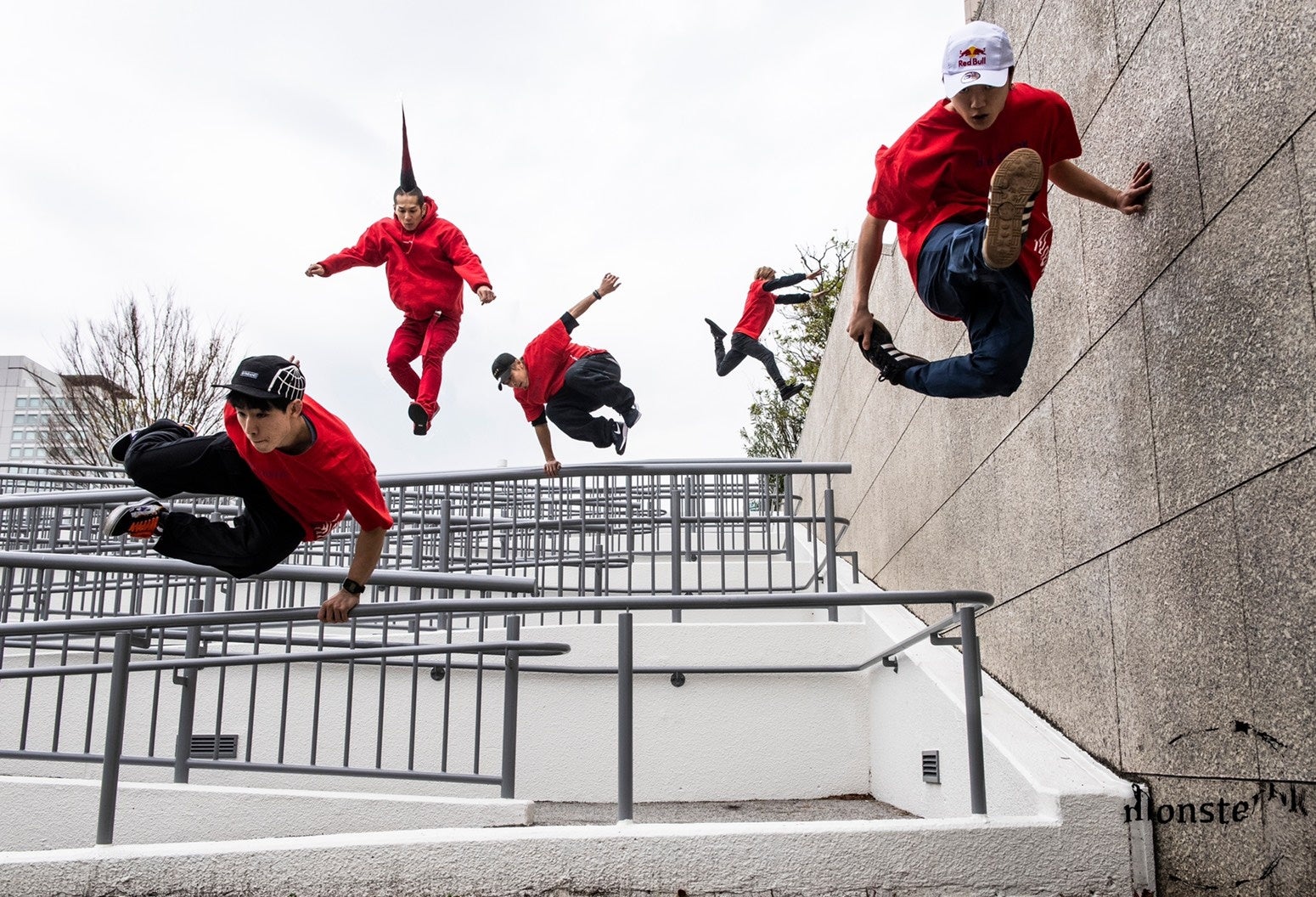まるで現代の忍者!!障害物を飛び越え、壁を駆け上がり、建物から建物へと飛び移る。ストリートでのトレーニングを通して身につけて身体能力を生かし、究極の移動追求し続けるパルクールアスリート集団。