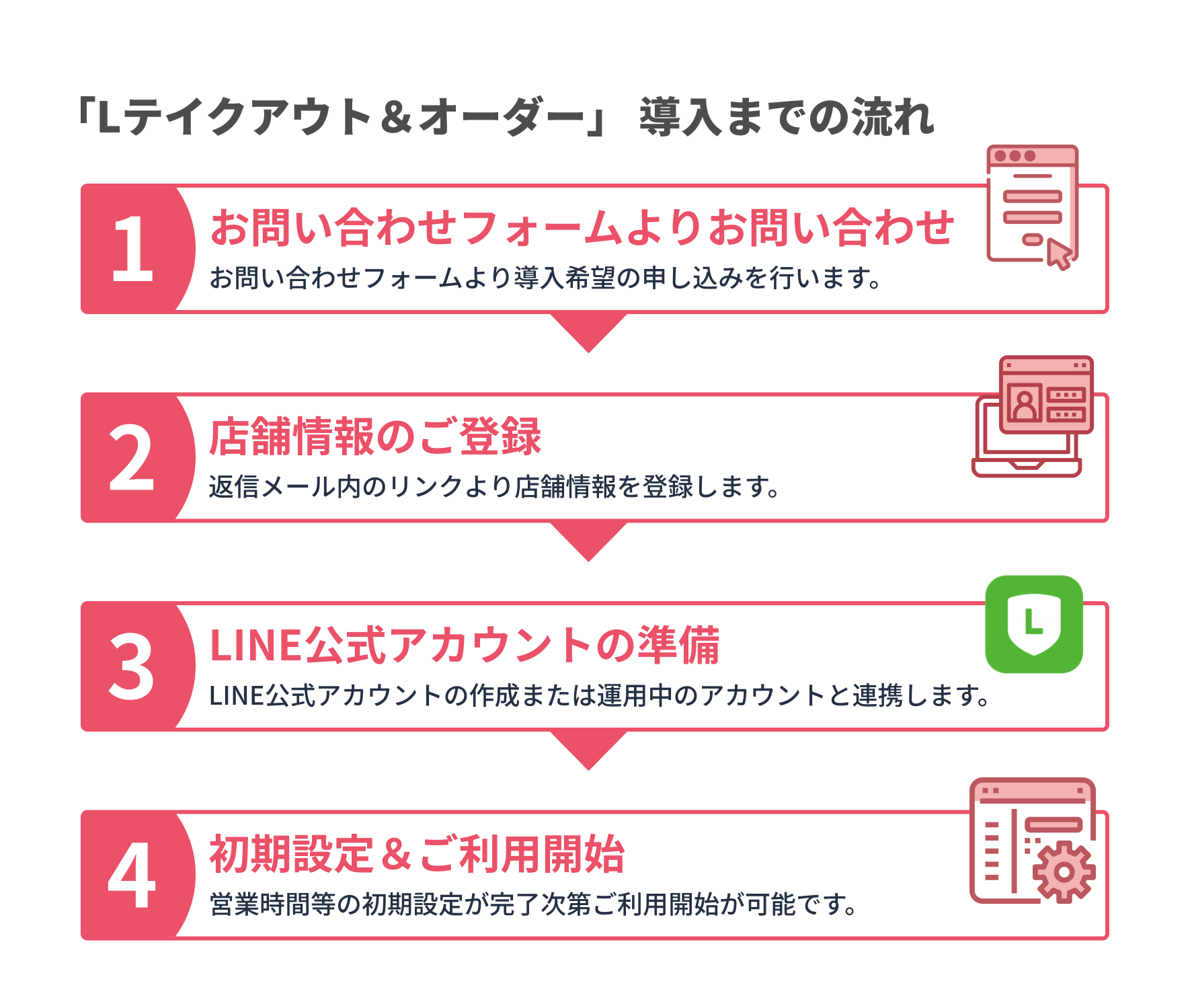 「Lテイクアウト&オーダー」導入までの流れは以下の通りです。尚、現在運用しているLINE公式アカウントを引き継いで利用することも、新しくLINE公式アカウントを作成して利用することも可能です。