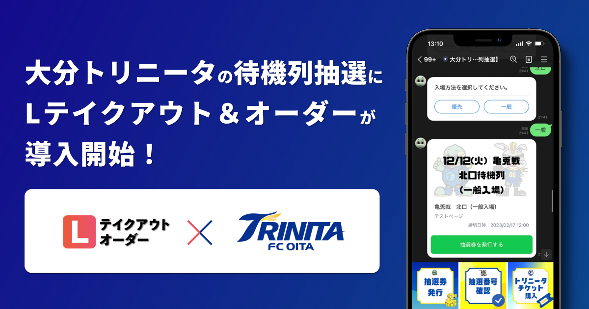 合同会社Oblivion(所在地:東京都千代田区平河町1-6-15、代表取締役社長:佐藤日出輝、以下Oblivion)が全国の飲食店500店舗以上に展開する「Lテイクアウト&オーダー」は、株式会社大分フットボールクラブ(本社:大分県大分市、代表取締役小澤正風、以下大分FC)が運営するプロサッカークラブ「大分トリニータ」の整理券取得システムとして導入されましたことをお知らせいたします。