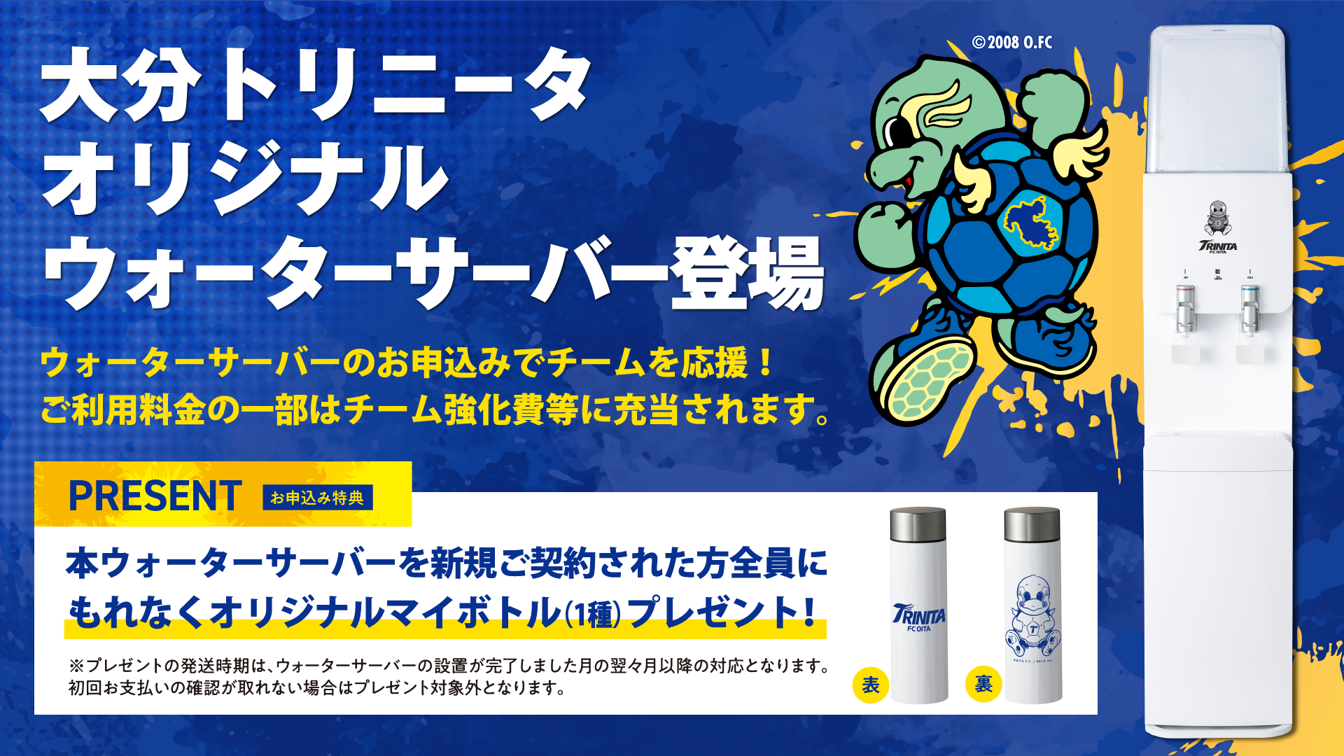 この度、大分トリニータを運営する株式会社大分フットボールクラブ(所在地:大分県大分市、代表取締役 小澤 正風)は、プレミアムウォーター株式会社(所在地:東京都渋谷区、代表取締役社長:金本 彰彦)とクラブスポンサー契約を結び、コラボレーションした大分トリニータオリジナルサーバーを2月26日(日)に行われるホーム開幕戦、東京ヴェルディ戦(レゾナックドーム大分、13:10キックオフ)より発売することになりましたので、お知らせいたします。