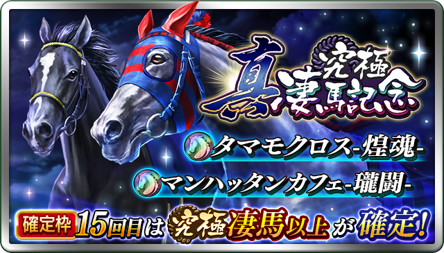 2023年2月23日(木)0:00から2023年2月28日(火)23:59までの期間、真究極凄馬として新たな才能「天霳月皎」を持つ★5「タマモクロス-煌魂-」と、新才能「瀟洒鷹揚」を持つ★5「マンハッタンカフェ-瓏闘-」が初登場する「真・究極凄馬記念」を開催します。