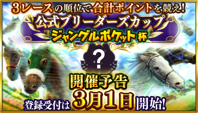 毎月行われている大規模大会を「公式ブリーダーズカップ ジャングルポケット杯」として開催します。ジャパンカップ、天皇賞(春)、天皇賞(秋)の3つの舞台の3レース行われ、各順位に応じて獲得できるポイントの合計数で競う総合ポイントランキングも実施します。