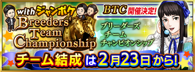 各牧場のオーナー同士でチームを組み、所属の競馬場で他チームと各レースを競いながら競馬場No1のチームを決める「withジャンポケ ブリーダーズチームチャンピオンシップ」のチーム結成が2023年2月23日(木)12:00から開始されます。