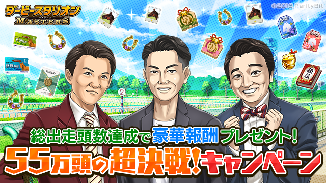 2023年3月4日(土)12:00 ~ 2023年3月17日(金)23:59までの期間中に、ゲーム内で全ユーザー様の「超決戦!ジャングルポケット(日本ダービー)」の総出走頭数をカウントし、一定数に達するごとに生産支援アイテムなどの豪華報酬を全ユーザー様にプレゼントします。