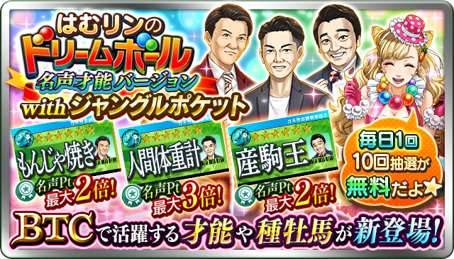 2023年2月23日(木)0:00から2023年3月10日(金)23:59までの期間、新規限定種牡馬「ドコニモキカナイ-闘覇-」や、BTCで活躍するコラボ限定才能「もんじゃ焼き」、「人間体重計、「産駒王」が登場する「はむリンのドリームボール 名声バージョン with ジャングルポケット」を開催します。