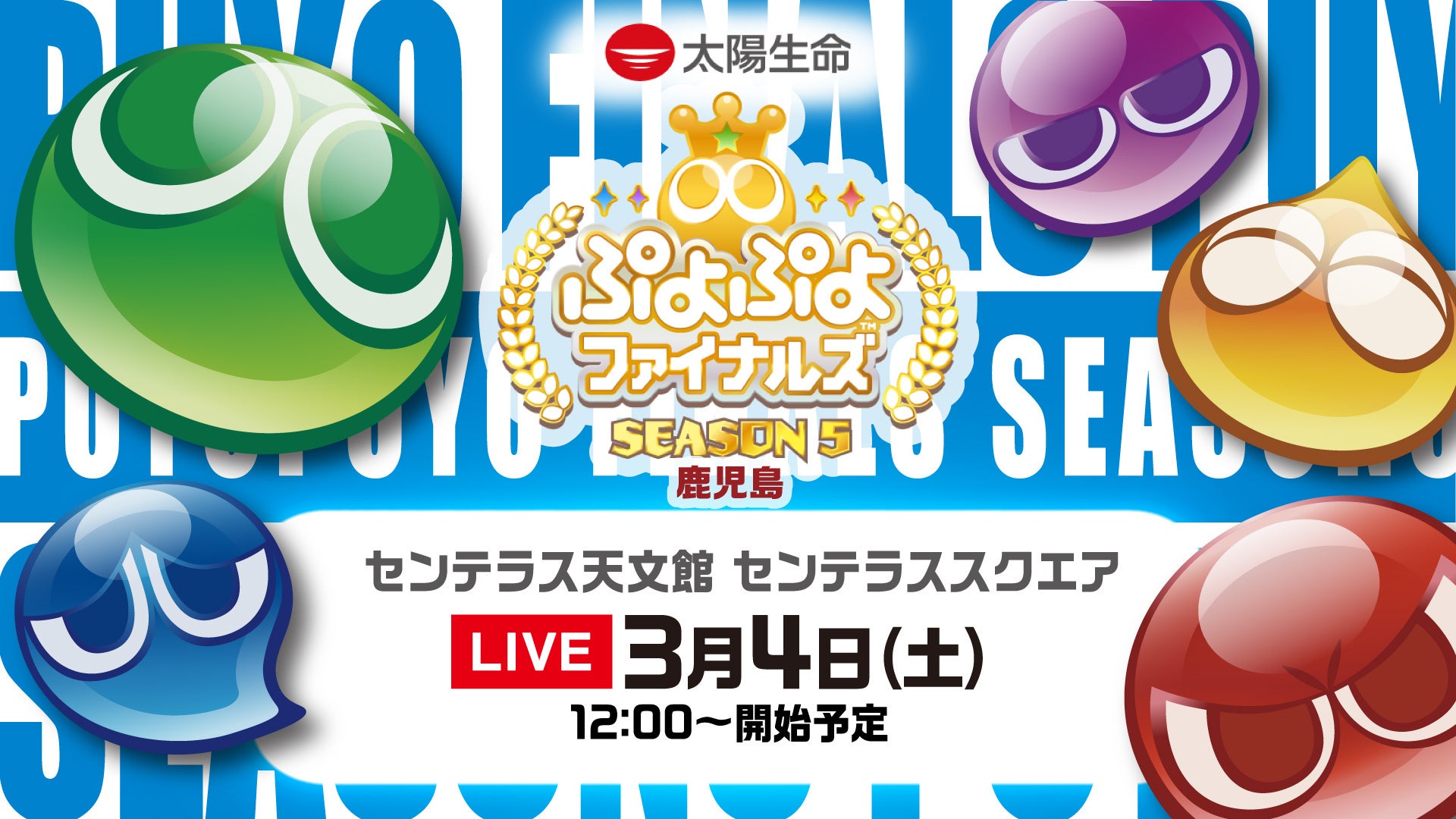 株式会社セガは、ジャパン・eスポーツ・プロライセンス認定タイトルである、対戦アクションパズルゲーム「ぷよぷよ」シリーズについて、2023年3月4日(土)に鹿児島県鹿児島市・センテラス天文館にて開催される、セガ公式プロ大会「太陽生命 ぷよぷよファイナルズ SEASON5 鹿児島」のインターネットライブ配信情報を公開いたしました。
